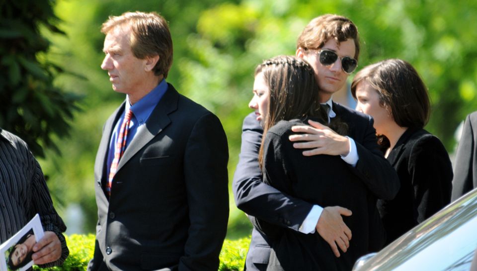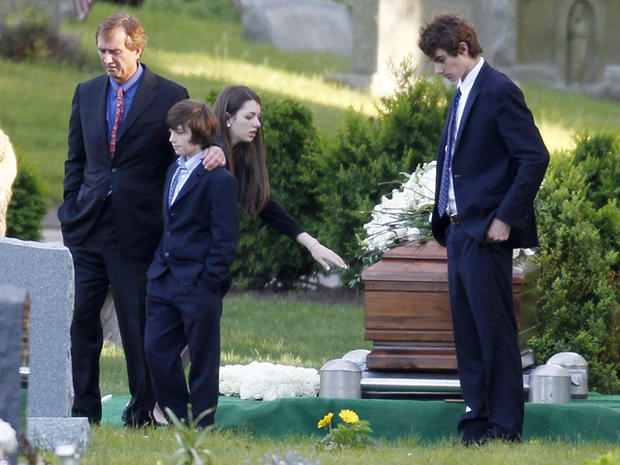 Robert F. Kennedy Jr., (left) and his children turn away after paying their respects at the casket of Mary Richardson Kennedy, in St. Francis Xavier Cemetery in Centerville, Mass., Saturday, May 19, 2012. Mary Richardson Kennedy was found dead at her home in Bedford, N.Y. (AP Photo/Michael Dwyer)