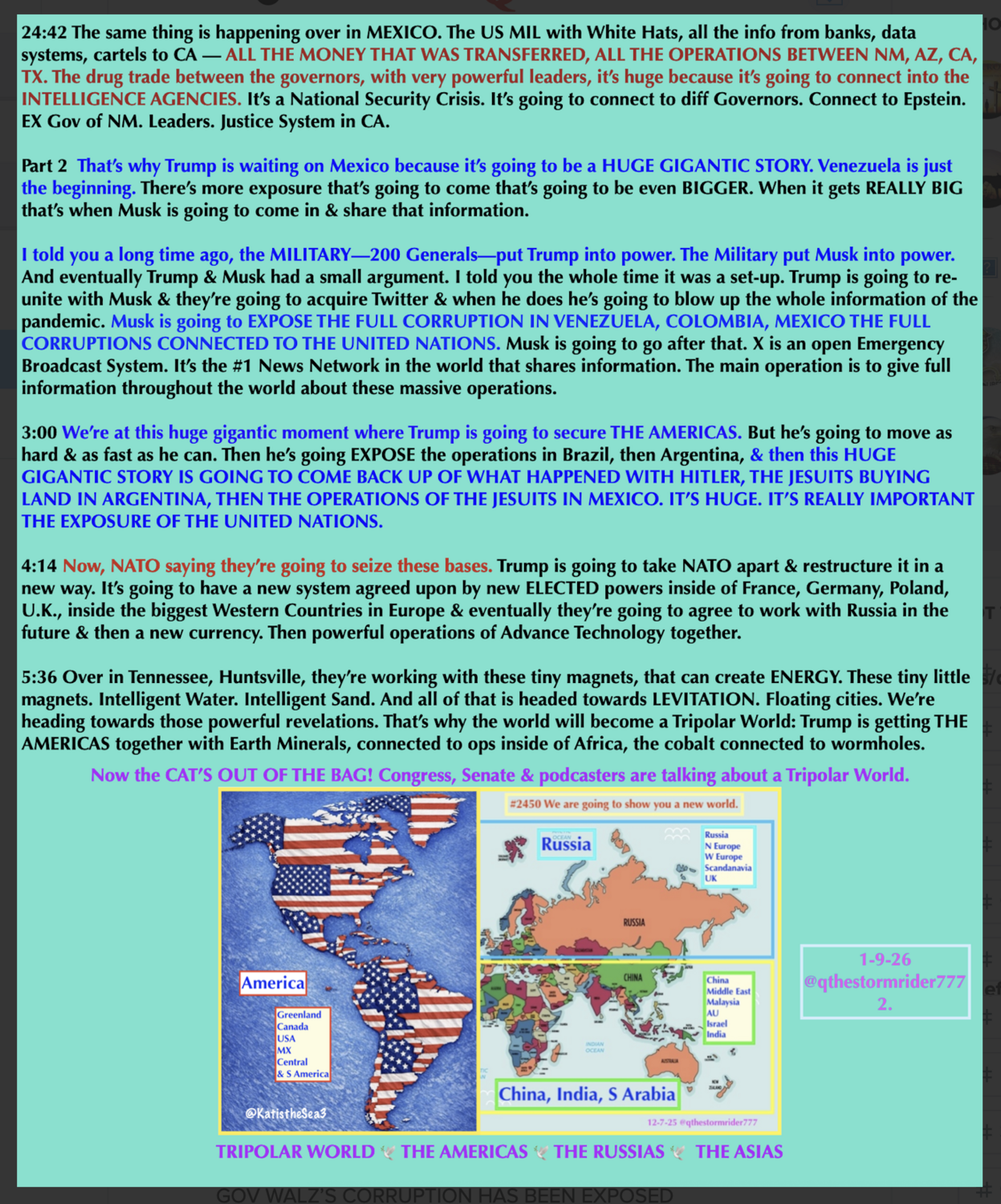 The Fourth Reich Operations in Brazil, Argentina, Mexico, and Antartica, as well as the related Bolshevik COMMUNIST Operations growing inside Cuba, Mexico, and Columbia, spawned by Rothschild in ancient Russia through Jesuit infiltration, now have a glimpse of what’s coming. Maduro’s Cuban Guards told the story of the Maduro Capture, leaving them helpless and incapacitated, basically begging for mercy as the White Hat energy weapons made them vomit blood, bleed from the nose and fall to their knees. Bad guy bullets couldn’t touch a living thing in retaliation. They were rendered completely powerless.