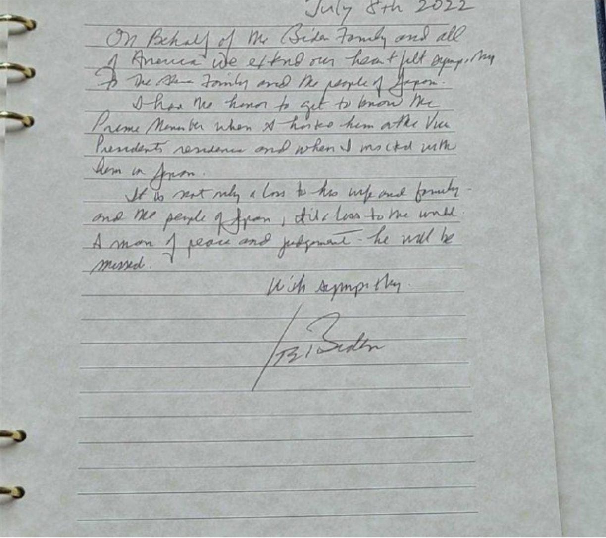 Joe Biden’s condolence to Shinzo’s family below signed on behalf of Joe Biden