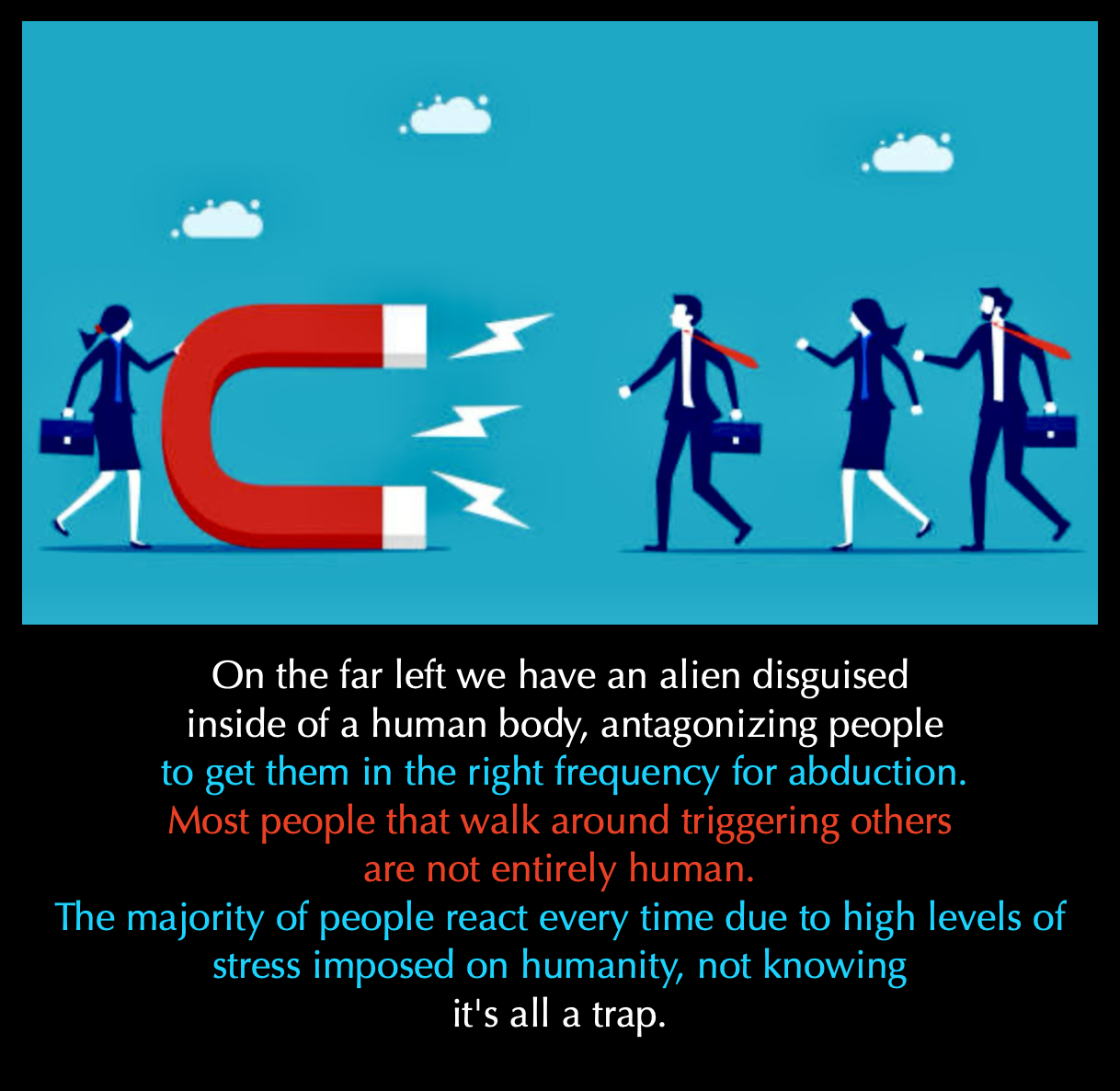 There are many reasons why people are abducted, but mostly it has to do with what frequency they’re vibing. Tempers, anger, fear, frustration, anxiety, sadness, hatred, jealousy,…these literally take people to the dark side. Star Wars was a very valid documentary.