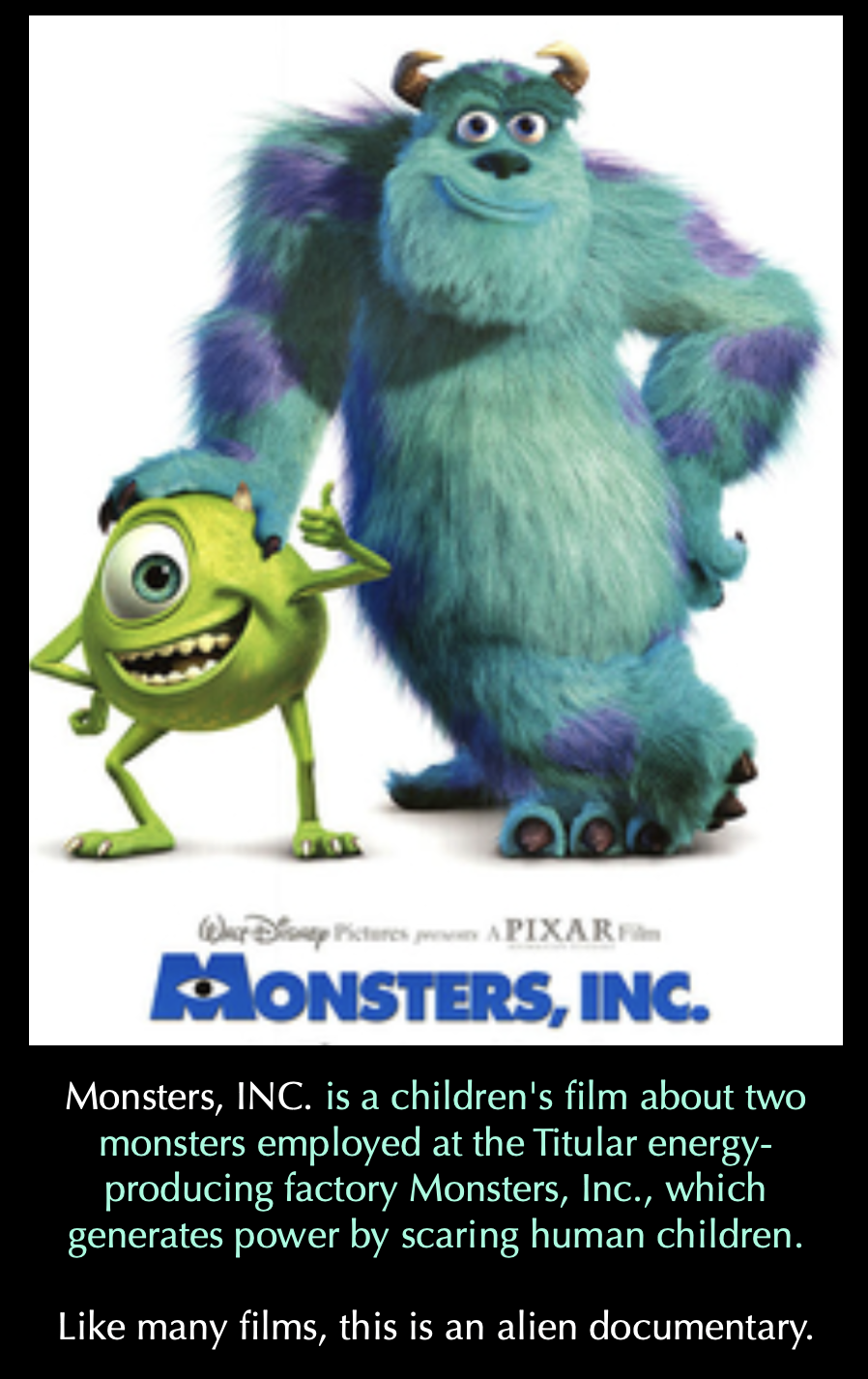 “In a world inhabited by monsters, the city of Monstropolis harnesses the screams of human children for energy. At the Monsters Incorporated factory, skilled monsters employed as “scarers” enter the human world to scare children and harvest their screams through electronic portals connected to the closet doors of children’s bedrooms. The ultimate plan is to kidnap children and extract screams from them using the Scream Extractor, which would generate enough energy to relieve Monstropolis of its energy shortage.