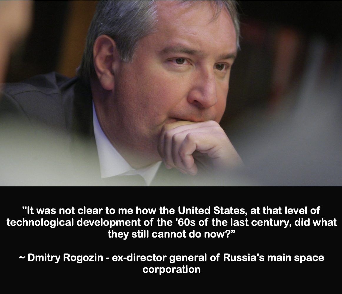 Dmitry Rogozin ex-director general of Russia’s main space corporation explained, he asked his leadership team to look into whether NASA had actually landed a dozen astronauts on the Moon in the late 1960s and early 1970s. After all, Rogozin reasoned, “It was not clear to me how the United States, at that level of technological development of the ’60s of the last century, did what they still cannot do now?”