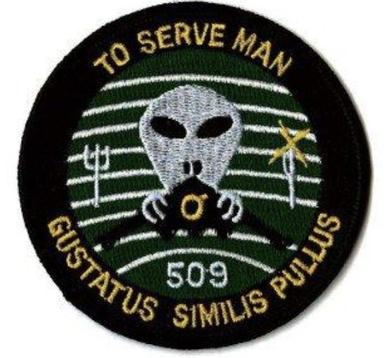 Notice their joke on the patch above. “To Serve Man,” with a fork on the patch and their famous abduction craft in alien hands. Gustatus Similis Pullus apparently translates as ” TASTES LIKE CHICKEN.” Many of these alien groups abduct, experiment on, torture, trade, sell and eat humans.