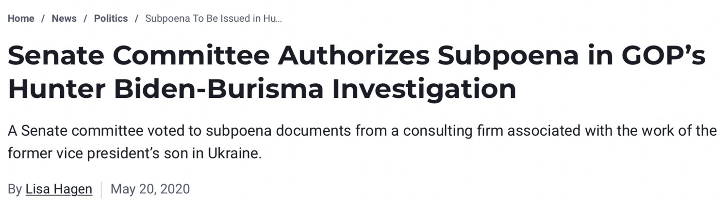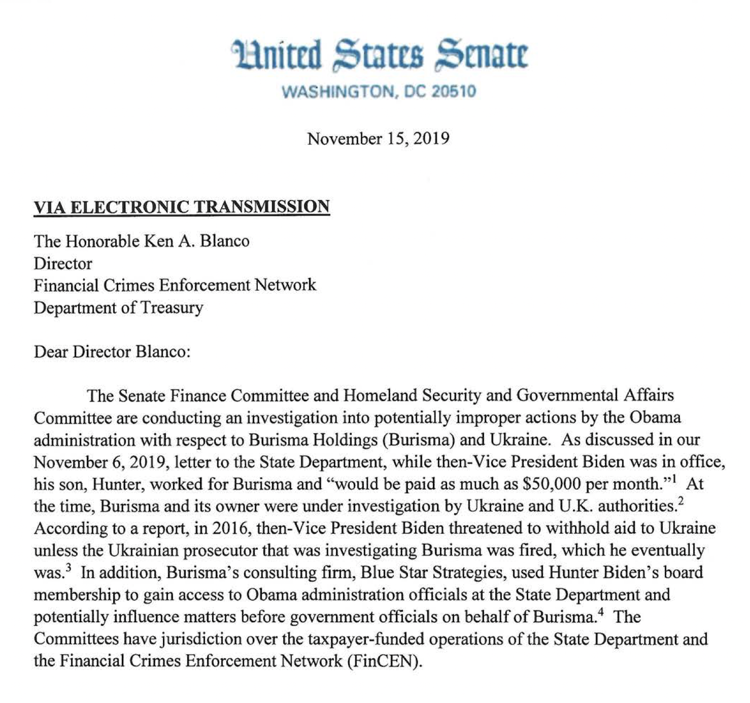 Senate Finance Committee, Homeland Security and Government Affairs Committee conduct an investigation into potential improper actions by the Obama administration with respect to Burisma Holdings and Ukraine.