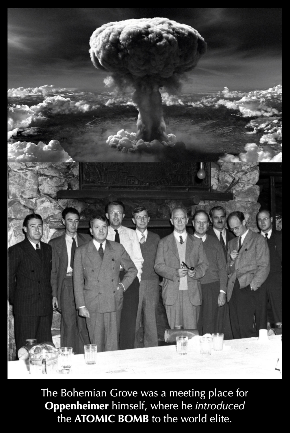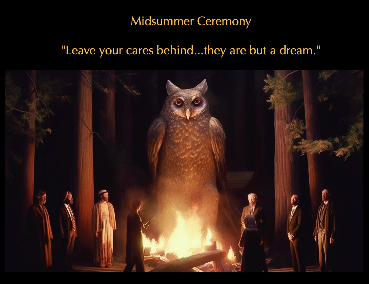 The ceremony takes place in front of a giant Owl Shrine wired with audio equipment to play a recording of the voice of the owl in the High Jinks activities. For many years the voice of Club Member Walter Cronkite animated the owl, intermingling the great wisdom of an owl, the authority of the most famous and trusted News Caster in America, with the need to remove conscience altogether for success in higher positions of power around the world. Mind control at a sinister peak.