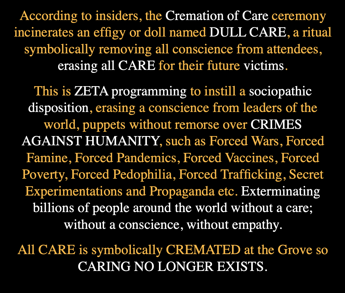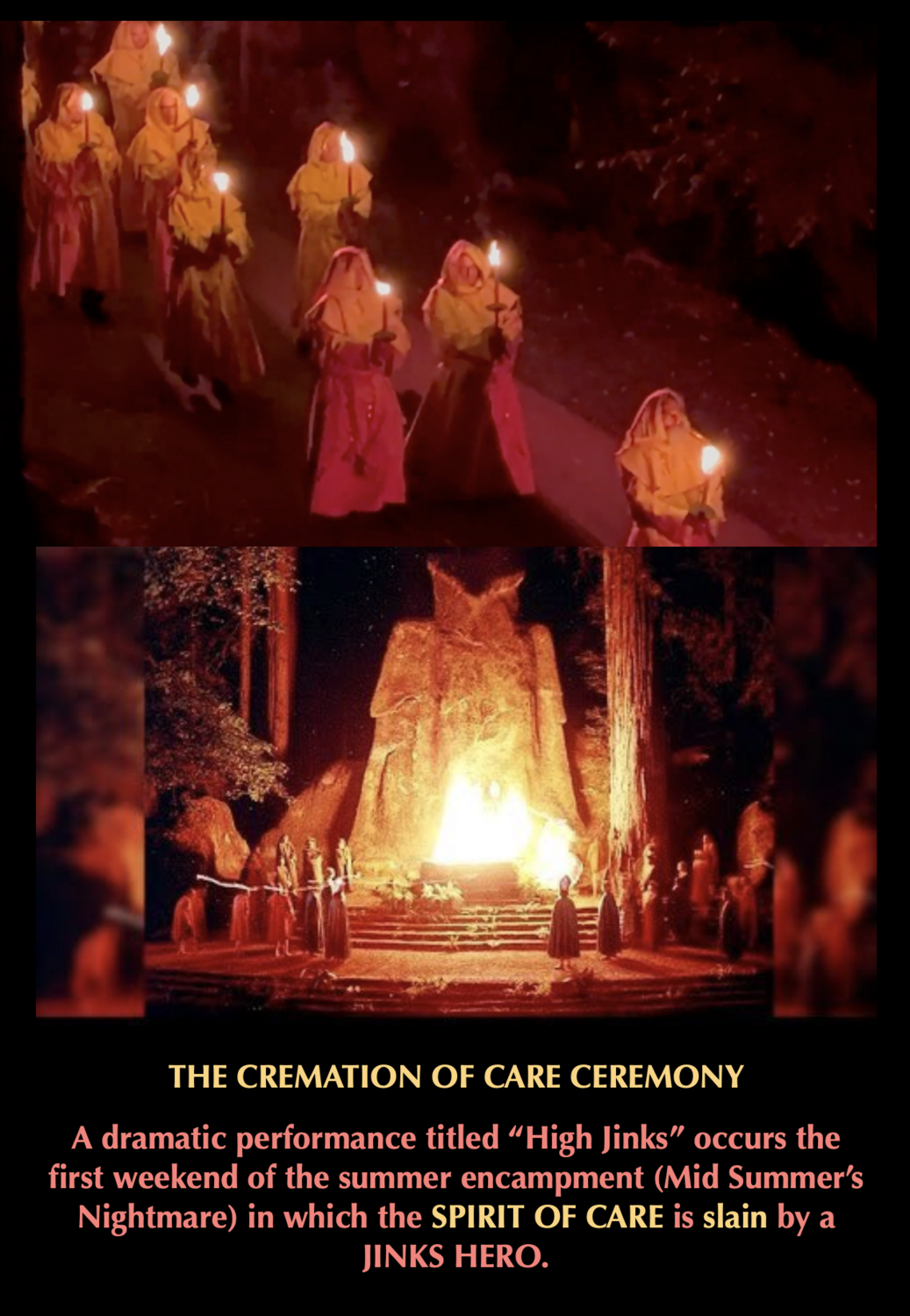 The Cremation of Care Ceremony takes place on the first night of the Grove get together, setting a precedence by exorcising or incinerating the so called Demon of CARE to ensure success during the following weeks.