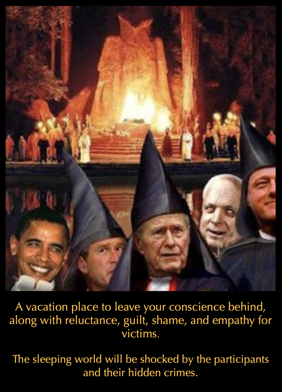 Many techniques, such as Aleister Crowley’s, “DO AS THOU WILT,” were invented to inflame ego driven desires to replace conscience. The dark need minions to do their bidding, and they’ve developed many “factories,” to turn regular every day good people into empty shells without empathy or conscience, who’ll do anything they’re told. The most openly blatant mind control factory might be The Bohemian Grove in Monte Rio, California; said to be a meeting place for elites to prepare minions for positions of power.