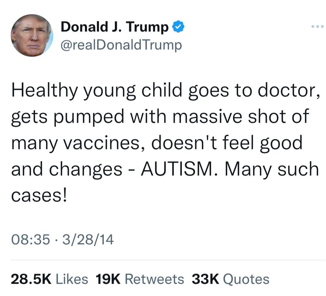 ONE OF MANY TWEETS ALERTING PARENTS IN 2014 TO VACCINE CONCERNS. PRESIDENT TRUMP HAS BEEN A LEADER AND TRUTH TELLER FOR A VERY LONG TIME.