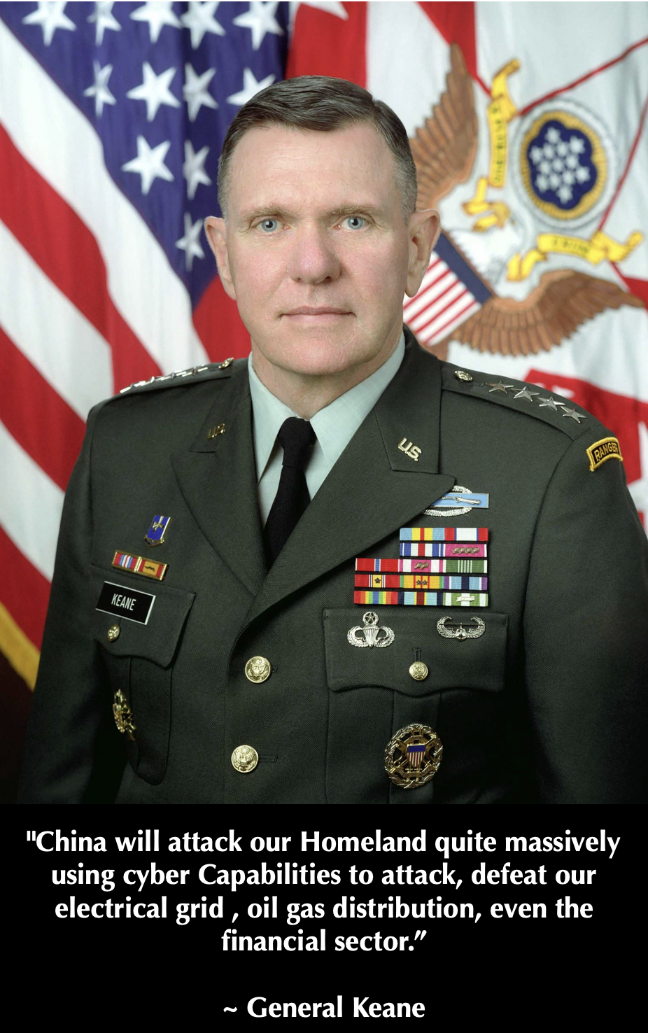 “China will attack our Homeland quite massively using cyber Capabilities to attack ,defeat our electrical grid , oil gas distribution even the financial sector.” …. Gen. Keane goes on to say China will try to defeat the u.s. inside the U.S. and Pacific regions