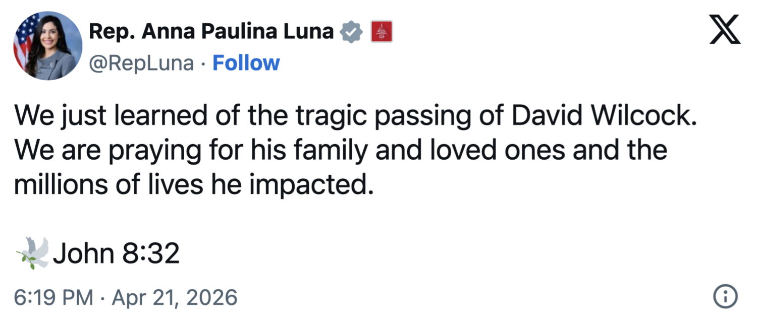 On Tuesday, April 21, 2026, US Representative Anna Paulina Luna confirmed the death of David Wilcock per reports he had taken his own life.