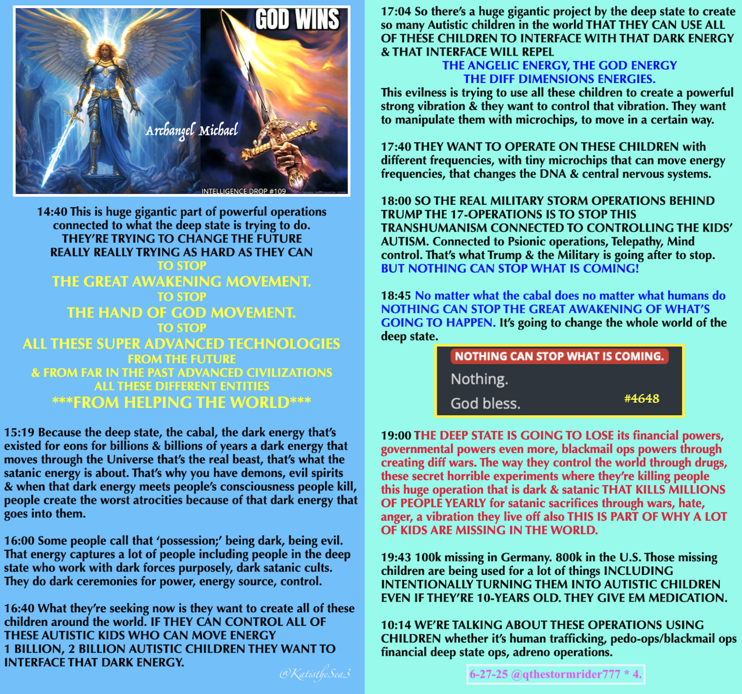 They have no idea whatsoever what they’re up against because they’ve been bullying innocent babies for practice. These babies have Spirits bigger than this planet, and they’re all coming for the dark now. It’s not just what’s inside of Cheyenne Mountain, it’s Creation itself coming for the bad guys to wipe them off the face of the earth and out of existence forever. Their playtime is WAY over.