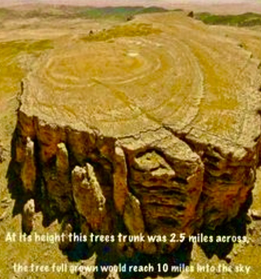 Many of the tree stumps below average from 3 – 6 miles in diameter; estimated to have reached 10 to 20 miles high. Imagine the size of this planet for that to be normal in the days before this section of earth was put under quarantine with an alien snow globe covering it.
