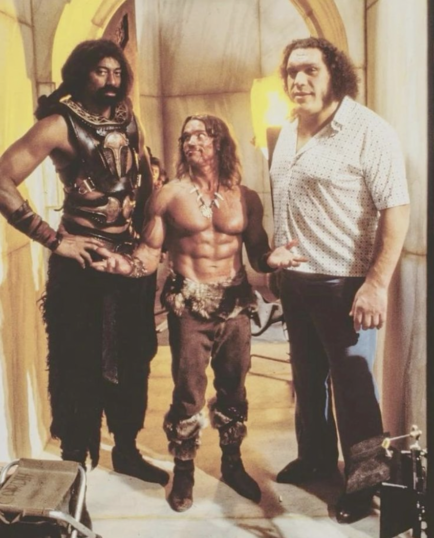 Arnold Schwarzenegger between Wilt Chamberlain and Andre the Giant
