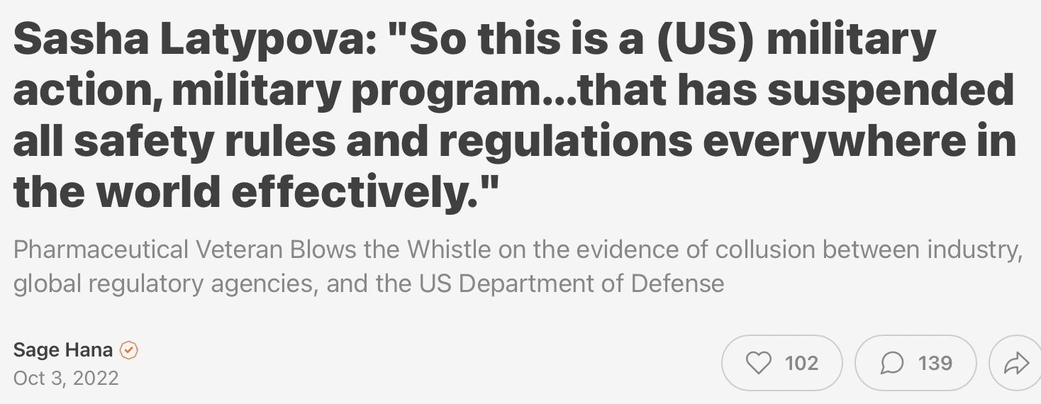 >SASHA LATYPOVA Comes forward with files and documents direct from the PENTAGON The Department of Defense DOD had contracts for the vaccines and created laws through OBAMA to protect the PENTAGON and their vaccine manufacturers from being prosecuted for vaccine manipulation and money financing/ funding the operations. The vaccines COVID 19 clinical trials were created years before the 2019 outbreak .DOD HHS NIH ect ect ect ect and top ELITES and commanders were ALL INVOLVED IN THE CREATION OF THE PLANDEMIC< the vaccines the clinical trials. The FUNDING operations. The censorship of EXPOSING the VIRUS. The Pentagon CIA CONTROL of planned Plandemic narration over MSM. and the censorship of hundreds of millions who tried to EXPOSE the deep state AGENDA virus CREATION<