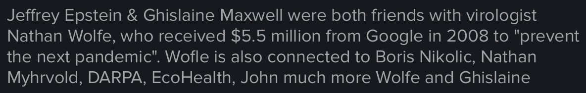 GHISLAINE MAXWELL a close friend with NATHAN WOLFE (aka Virus Hunter), who in 2011 published a book named “THE VIRAL STORM” about the upcoming PANDEMIC. In the book, WOLFE thanks JEFFREY EPSTEIN and Dr. SANJAY GUPTA for their contribution Support and donations.