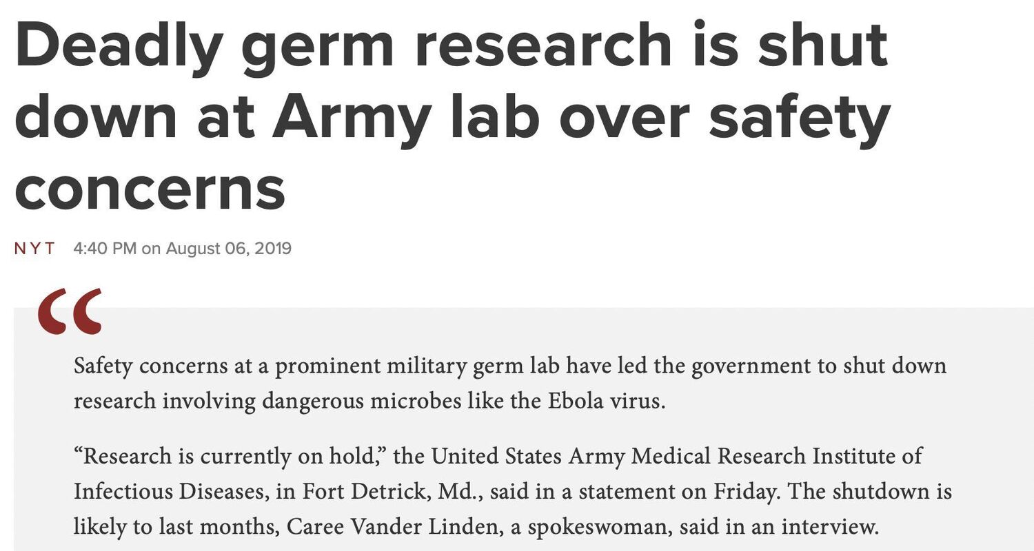 Near FORT DETRICK military base… The Maryland NIH FAUCI lab leak story even made it to New York times in AUGUST 2019 ( but a cover up was quickly pushed) “DEADLY GERM RESEARCH IS SHUT DOWN AT ARMY LAB OVER SAFETY CONCERNS”