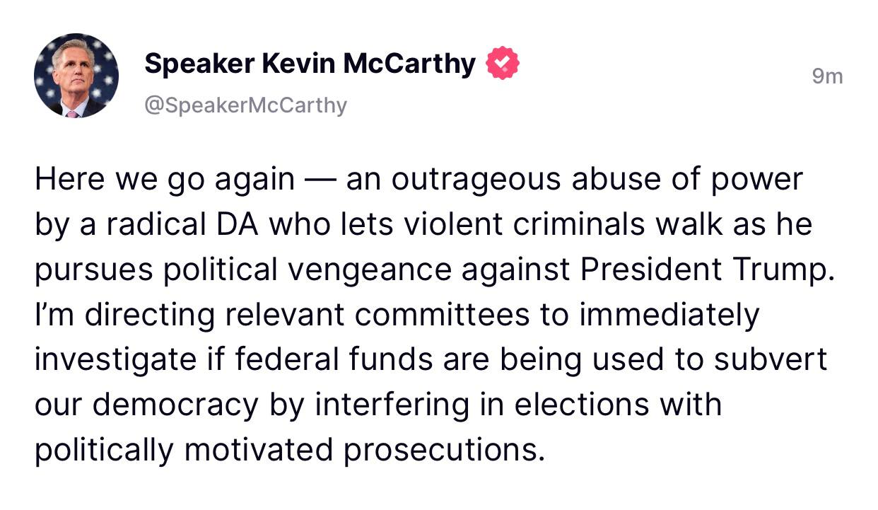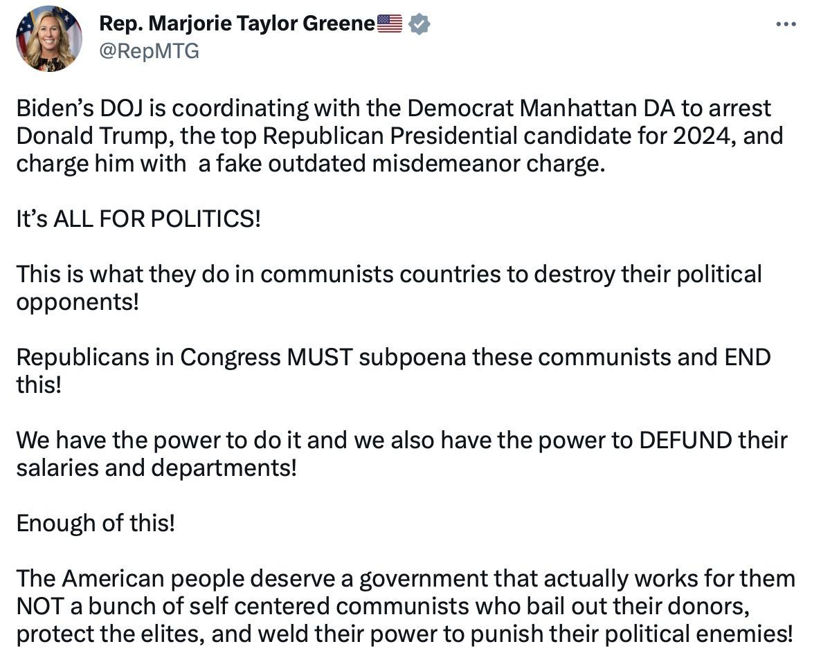 Everyone knows it’s a sham. In fact, the Department of Justice stocked the DA’s office with top people from DC to help ‘Get Trump’ at a local level. Americans will not tolerate Radical Left Democrats turning our justice system into an injustice system to influence a presidential election, which is all they want to do. Our Country is not going to let this happen. This will backfire massively for the Democrat Party, and end in disgrace for our Nation.”