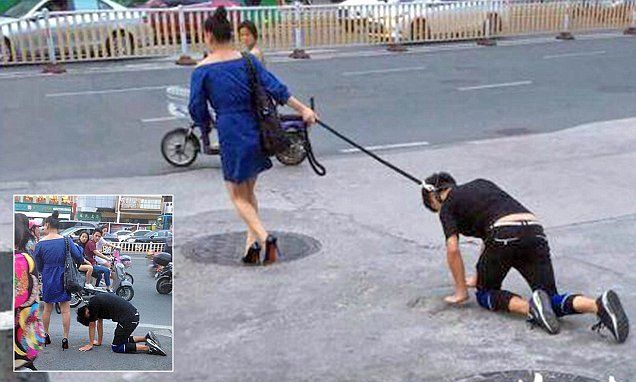 Woman in China taking her boyfriend for a walk on a dog leash. Hollywood and the Music Industry corrupt people worldwide.