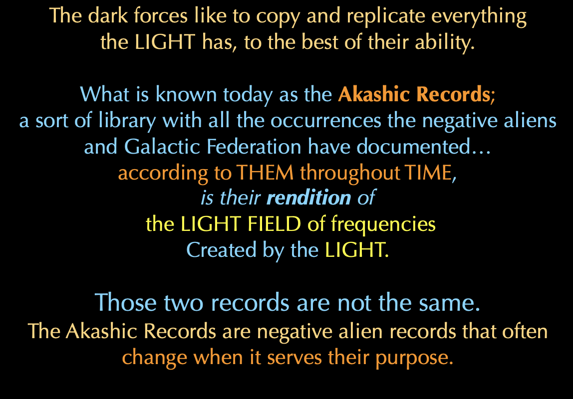 The CIA backed New Age group promote the Akashic Records as though it were a Source Created record of existence. IT IS NOT. They do this on purpose to lure spiritually gifted people into searching for the records to access them. Once they do, they have, on their own volition, entered negative alien territory. That gives the aliens permissions of sorts to use them in ways they may not be aware of. Seeking the Akashic Records is not advisable. They’re not reliable, so it’s a waste of energy to even consider them.