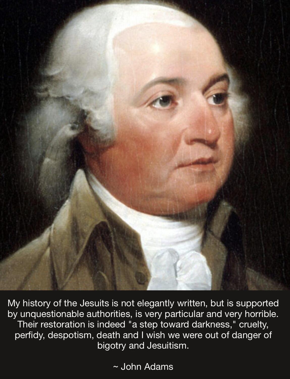 Thomas Jefferson answered Adams: “Like you, I object to the Jesuits’ reestablishment which makes light give way to darkness.”
