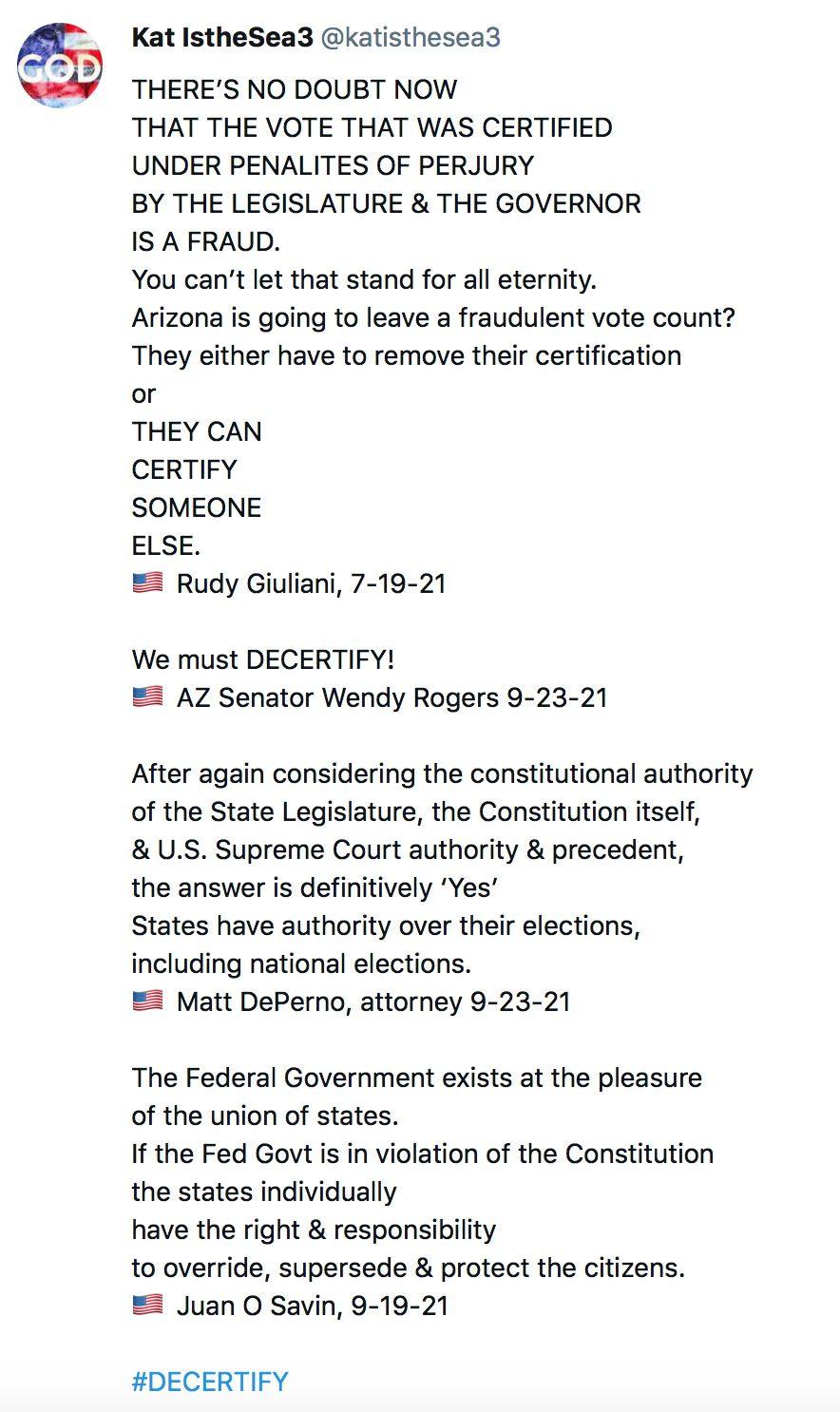“I am sure that Donald Trump was actually elected by at least 80 million lawful votes and that things were done in this electron that constituted massive election fraud by a significant number of people, including machines of various kinds involved in it.
