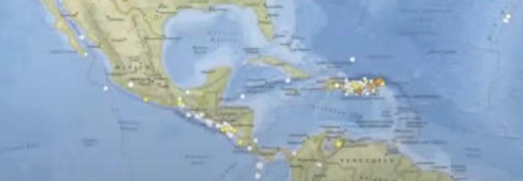 38:16 Gene Decode: Central America, a lot of D.U.M.B.S. being cleared & taken out. [White dots on the map are the D.U.M.B. earthquakes]