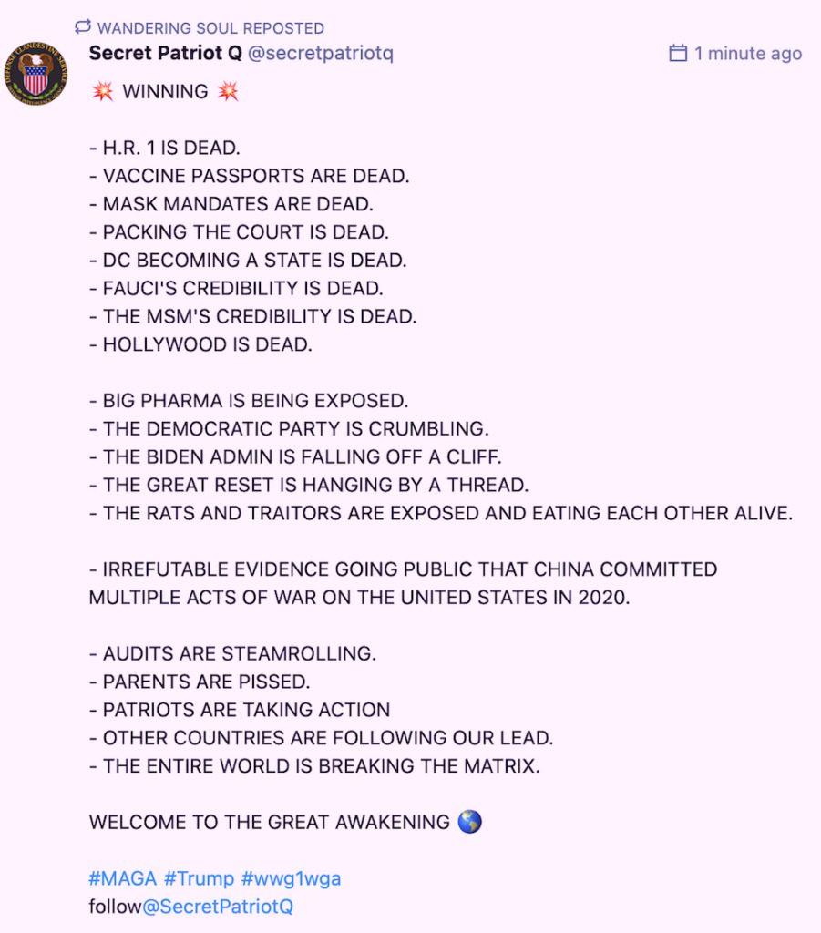 “We continue to learn a lot on how the world is truly run. The Great Awakening.” CJTRUTH, Telegram