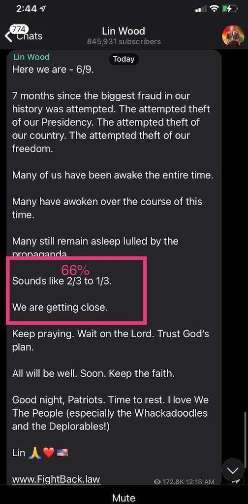 On 6-9-21 Lin Wood surmised that 66% are AWAKE. I think we’re at the tipping point.
