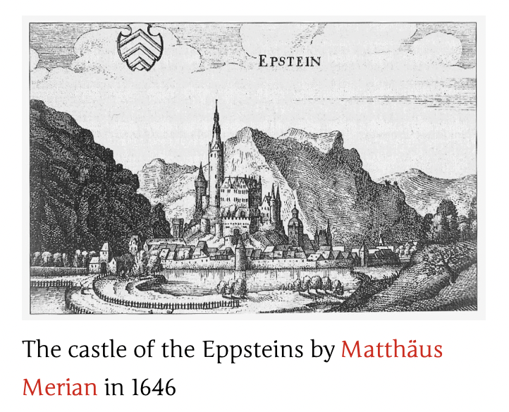 In Hesse the Lords of Eppstein were a family of German nobility in the Middle Ages. From the 12th century onwards they ruled extensive territories in the Rhine Main region from their castle at Eppstein, northwest of Frankfurt. However, their line became extinct in 1535 and the Eppstein name no longer featured in that area. Instead the Epstein surname has had Jewish origins.
