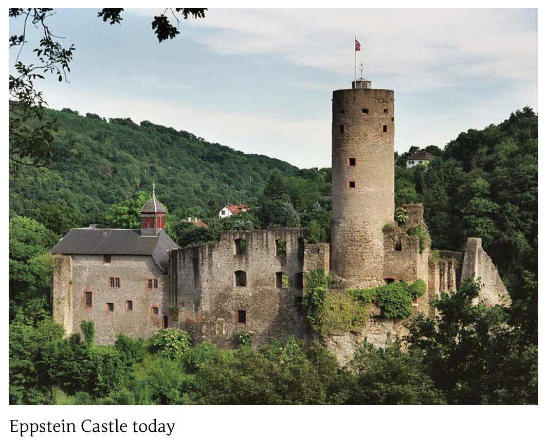 Four of the seven Archbishops of Mainz and Electoral Princes in the 13th century were of the house of Eppstein. They raised the Electorate to considerable power and played a significant role in the politics of the HOLY ROMAN EMPIRE. In the struggle between the Emperor and the Pope, Archbishop Siegfried III took sides with the anti-Staufer group which played an important part in the beginnings of German federalism. The secular Eppsteiners, by purchase, marriage and enfeoffment, acquired extensive territories and rights between Middle Rhine to the Vogelsberg hills and between the LahnRiver to the Odenwald.