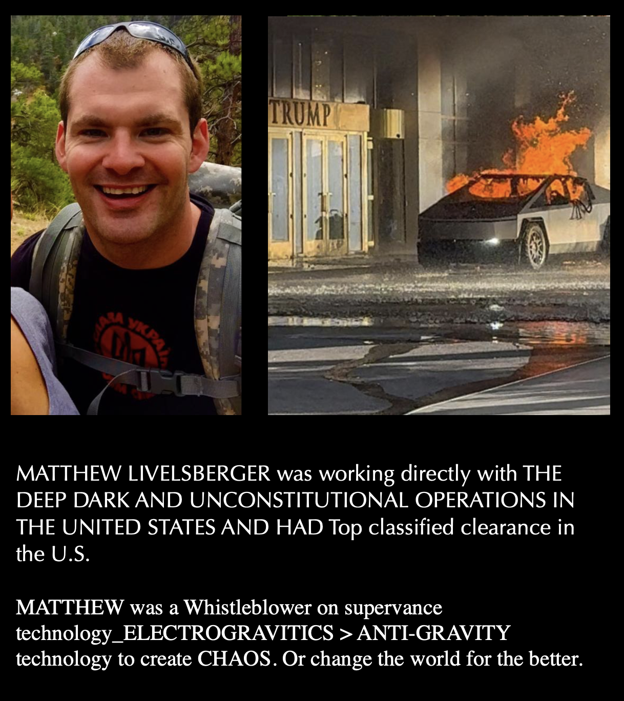 > MATTHEW LIVELSBERGER was working directly with THE DEEP DARK OPERATIONS AND UNCONSTITUTIONAL OPERATIONS IN THE UNITED STATES AND HAD TS/SCI CLEARANCE … One of the few Top classified clearance in the U.S. /// Matthew Livelsberger was coming forward as a Whistleblower on the drones the supervance technology hidden underneath military basis and the United States that are using infinite energy plasma drones, and _ELECTROGRAVITICS > ANTI-GRAVITY energy and the operations under Douglas., Area 51_ ( older operations since closed) and several operations in the United States and Germany that have advance anti-gravity technology to create CHAOS . Or change the world for the better.
