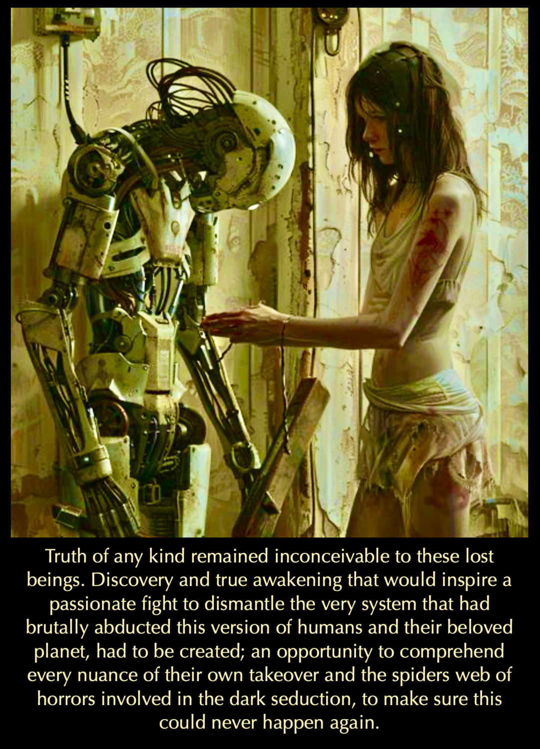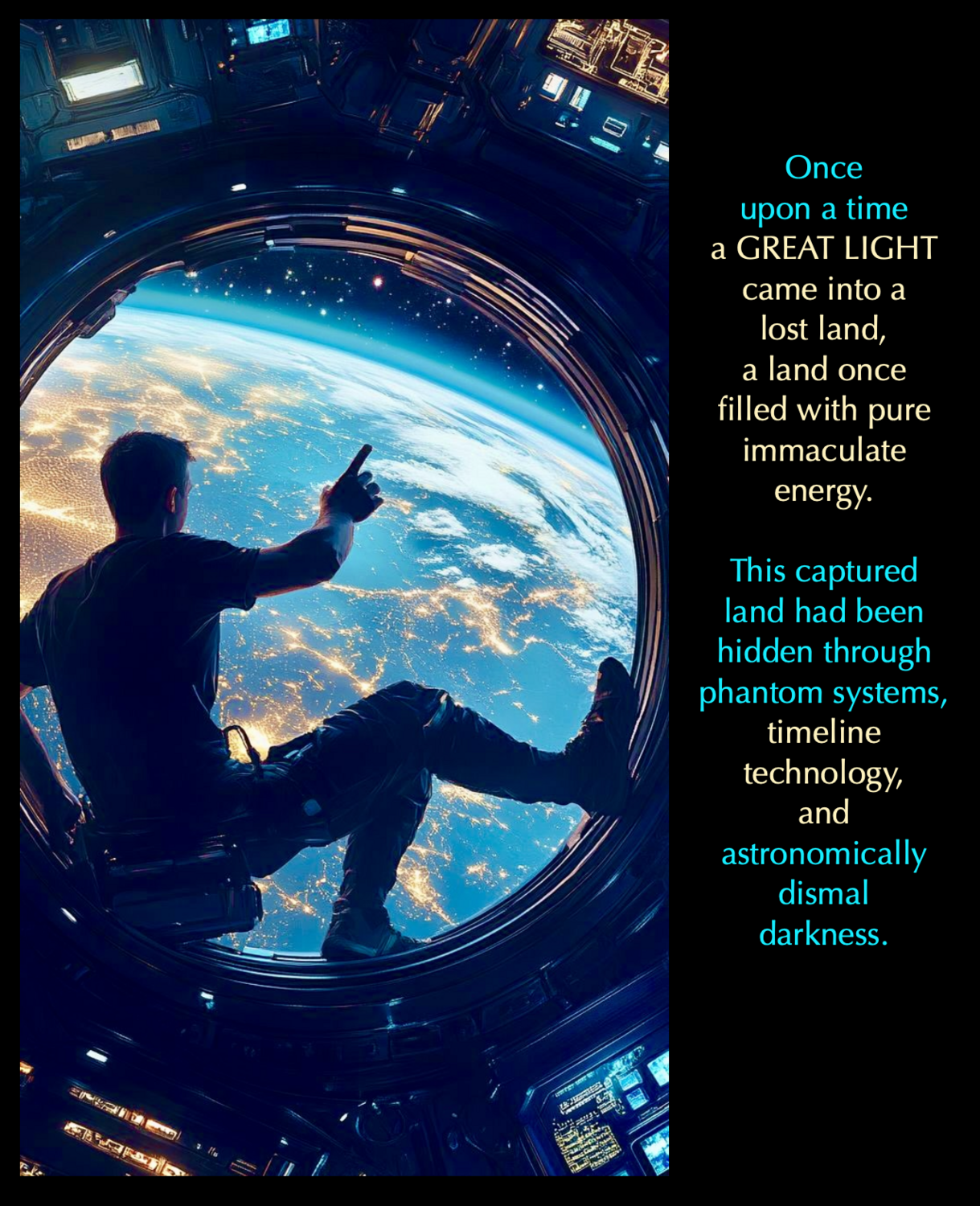 The GREAT LIGHT stepped foot upon this desolation in total bewilderment, incapable of comprehending or integrating what had occurred and why, embarking upon an agonizing emancipation of the inhabitants who had remained alive, unveiling and unravelling the hidden story behind a devastating consumption of Light and Life.