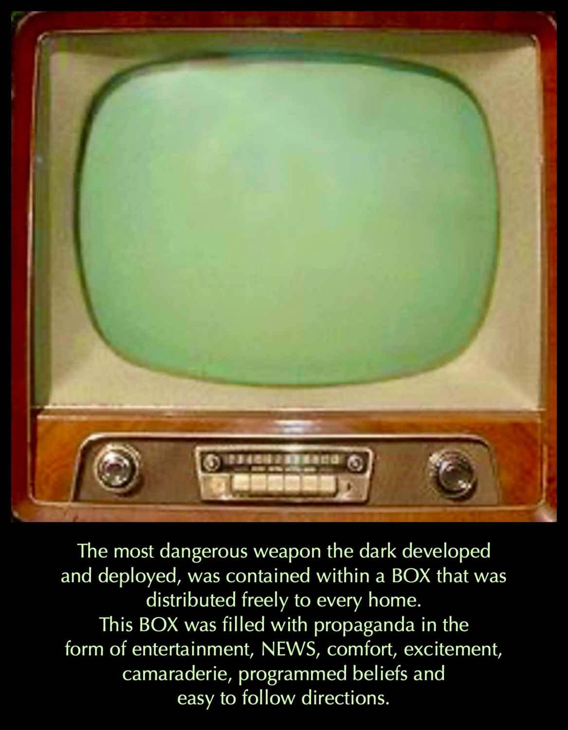 Every household, diner, airport, school, business, hospital and truck stop had their very own BOX, activated day and night, keeping inhabitants glued to the programming, following orders given religiously.