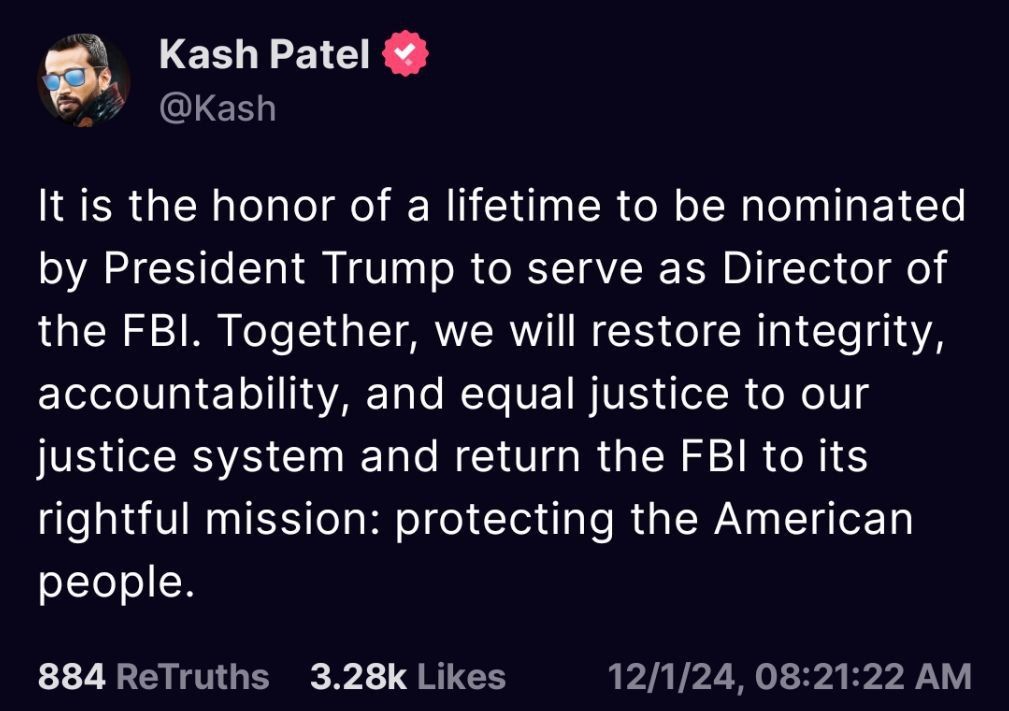 “President Trump has sent shockwaves through the system, putting the Deep State on high alert with a monumental announcement. At 6:47 p.m. EST yesterday, he declared: “Kash Patel will serve as the next Director of the FBI.” Known as a relentless “America First” fighter, Kash Patel has exposed corruption at the highest levels, dismantling lies and restoring accountability. Trump made it clear: “This FBI will end the crime epidemic, dismantle migrant criminal gangs, and stop human and drug trafficking across the border.”
