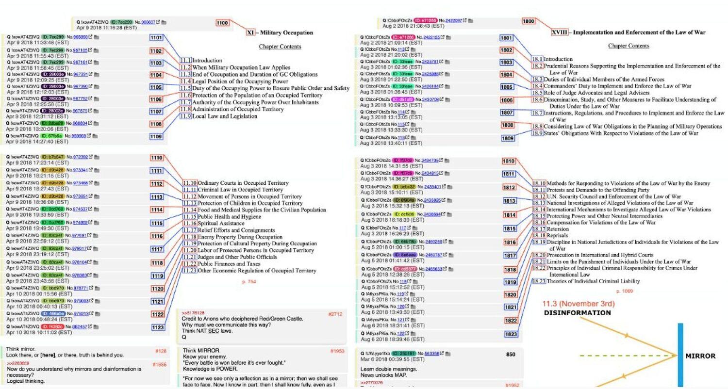 “When we mirror Q’s posts into the Law of War document, we find hard proof that the Q team not only knew in advance that all of this was going to happen but actually secretly COMMUNICATED all of this information to us through the drops themselves, with PLAUSIBLE DENIABILITY, when mirrored into the Law of War Manual. The main correspondence I have found of these types are: