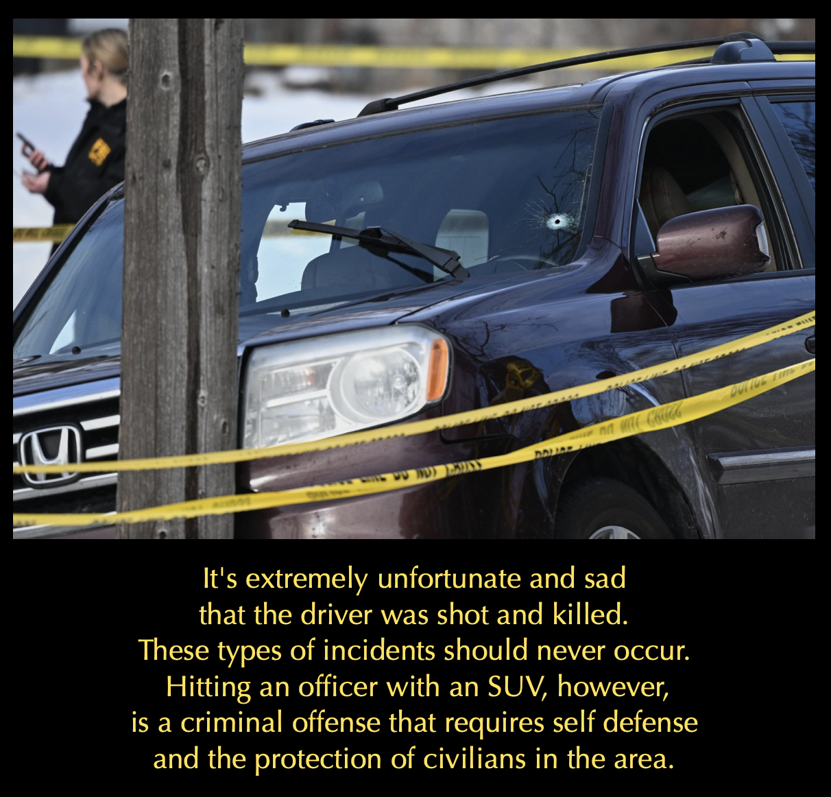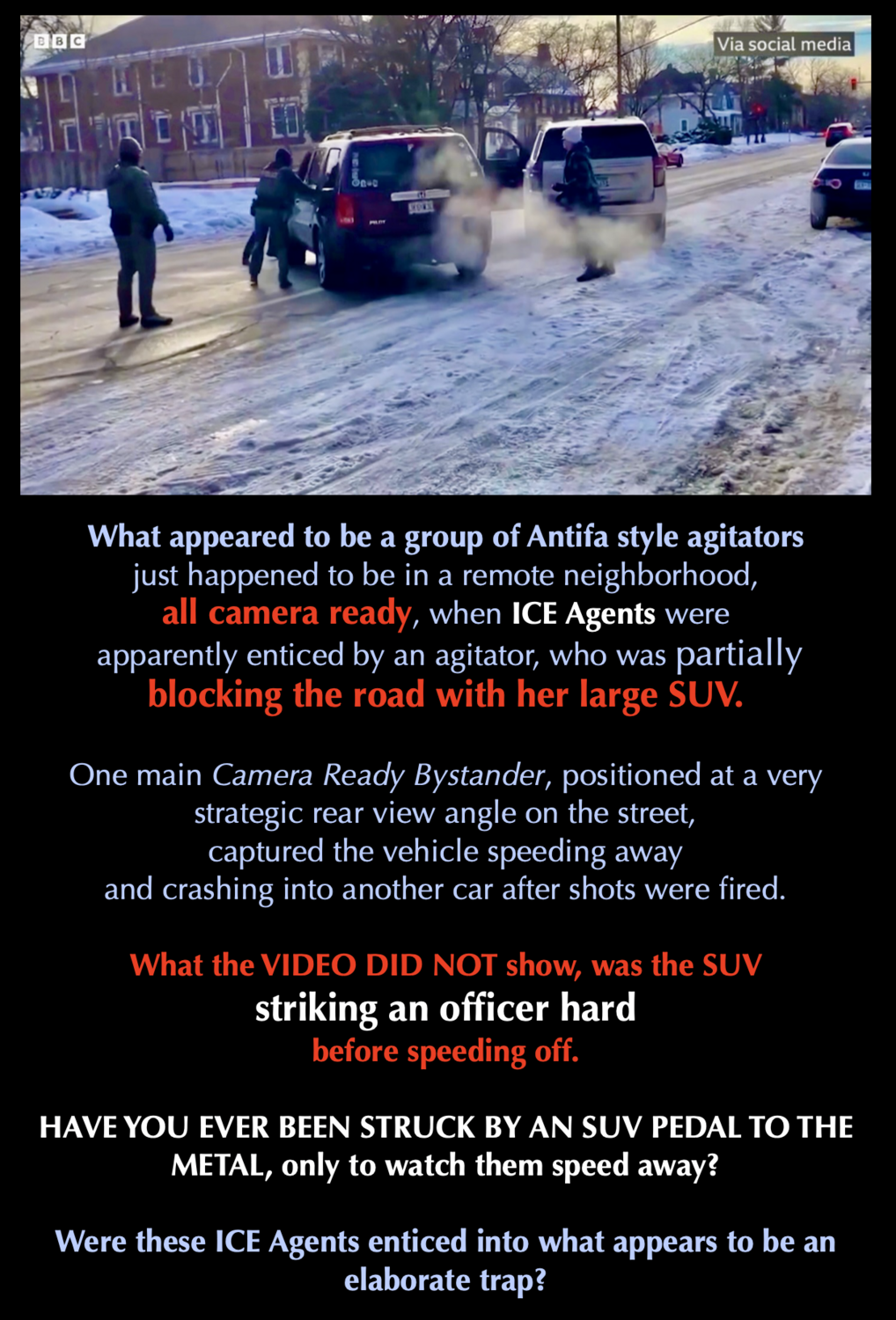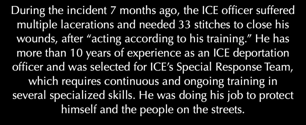 This Camera Ready Bystander, who happened to capture the rear view of the incident, began to SCREAM, “SHAME SHAME SHAME” to the ICE officers, howling expletives and outrage loud enough for the entire neighborhood to hear, leaving out the fact that the officers were defending themselves against an attack of hit and run.