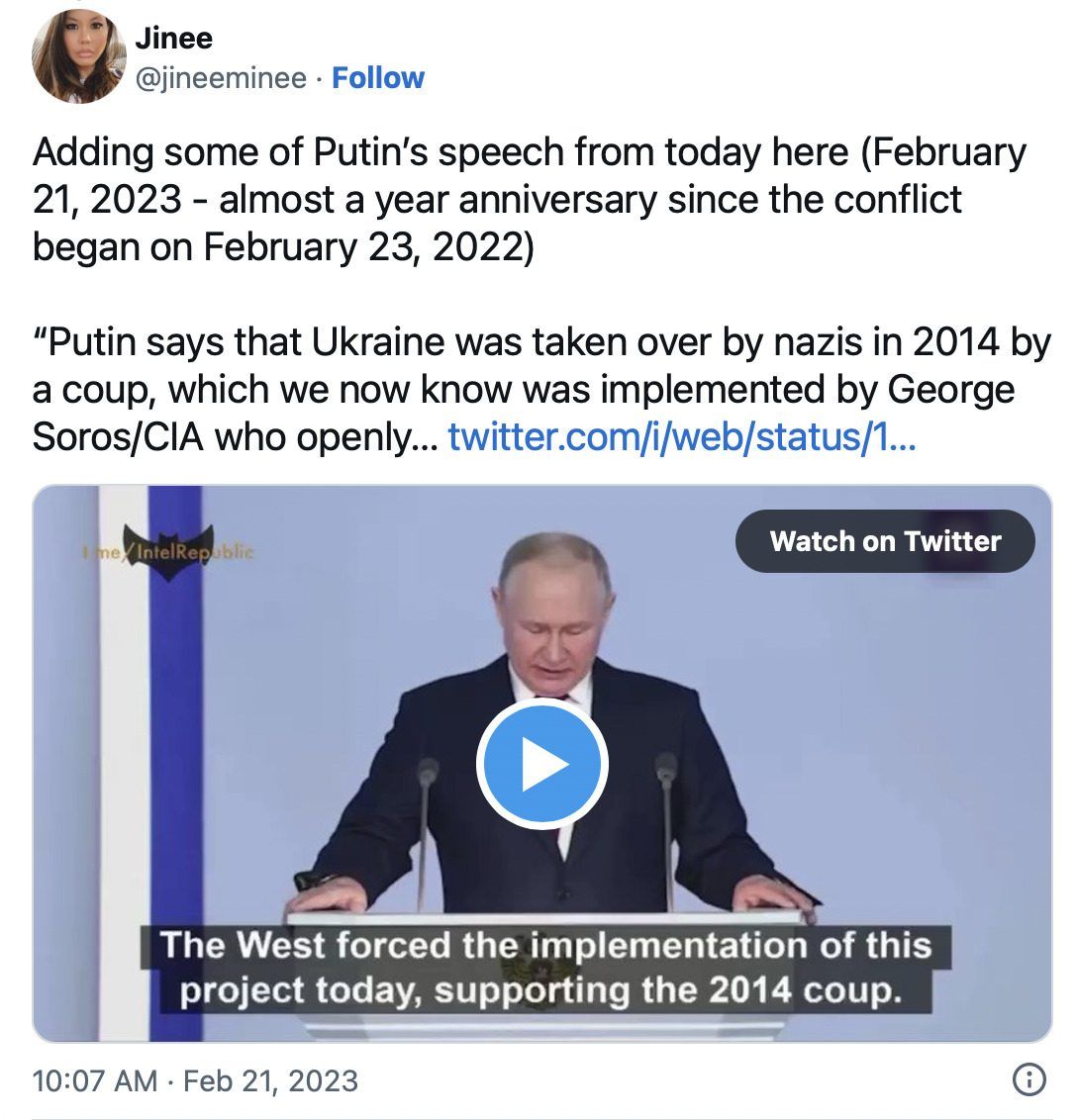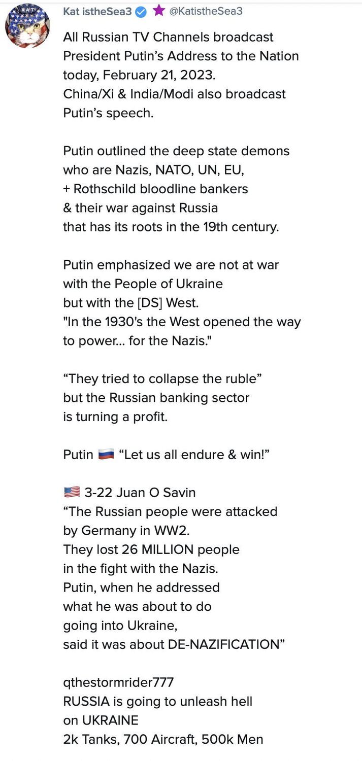 News Propaganda in the West conveniently overlook the HEART of Putin’s speech, as he carefully unfolds the true history of Russia / Ukraine and NATO’s involvement in this war. Russia is the enemy of Satanists that want to enslave every man, woman and child on earth and beyond.