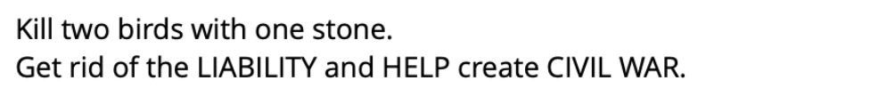 “We are a movement that values peace, love, unity and freedom – not just for America, but for the entire world. Anyone who promotes violence is immediately shunned by our great community as a whole.“