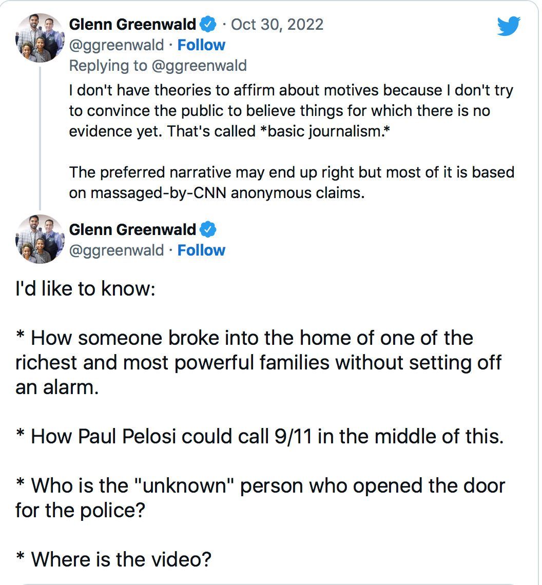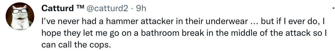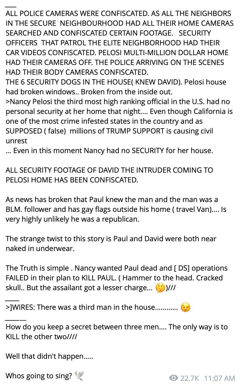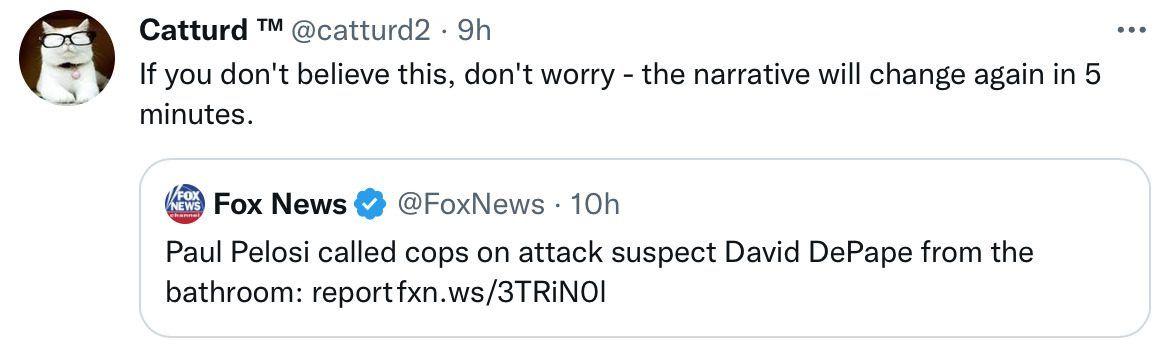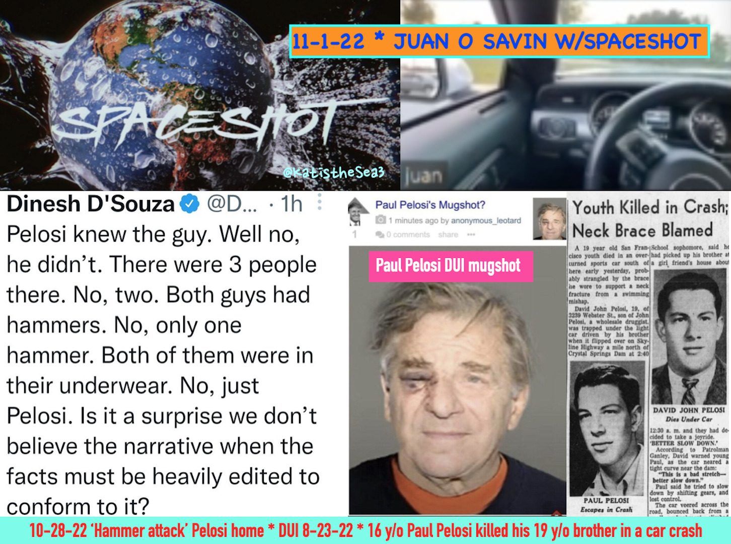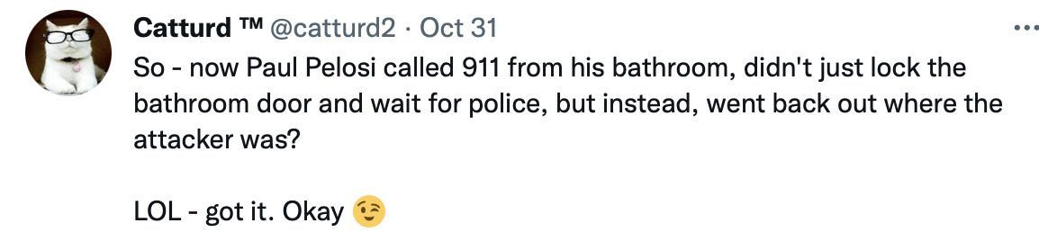 ~ Paul Pelosi apparently received permission from an intruder with a hammer to use the bathroom early Friday morning, where he happened to have his cell phone and was able to call 911 at 2:23 a.m. The 911 call records Paul saying there was a friend who’s name was David in his house. This may explain why all of Paul’s attack dogs knew the supposed intruder and did not attack him.