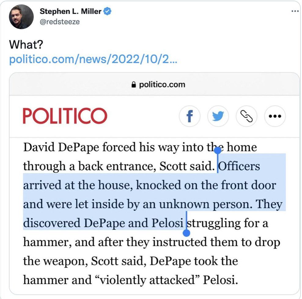 ~ If the police entered the house onto a violent scene with DePape holding a hammer while grasping Paul Pelosi’s forearm, why did the officers simply stand there and not draw their guns to stop the attack? Instead, the officers asked the two men in their underwear what was going on and DePape responded that “everything was good,” according to a report on CNN Politics.