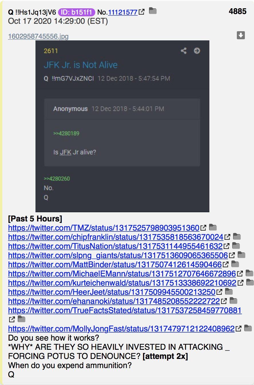 On October 17th, 2020, Q reposted his Dec 12, 2018 post answering “No,” to JFK Jr. being alive. Along with it, he posted numerous links to announcements made by either false patriots, DS players or unknowing people, claiming JFK Jr. would appear at specific venues, in which he never appeared or was never seen. Perhaps Q was attempting to put a stop to the ridiculousness of these announcements, which made a laughing stock out of the Q movement and the patriots, as well as depleting moral. It is interesting that a few networks somehow knew about and often reported on these no shows to publicly humiliate the Patriot movement and their beliefs.