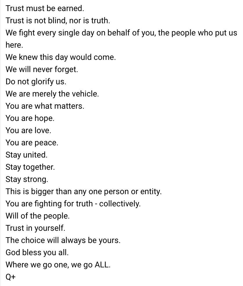 This is a FREE WILL planet. Q and Q+ will not interfere or make choices for us. They patiently wait on humanity. They also must allow the Deep State to play their cards. WHY? Because this experience is our creation and we must stand up for our rights to evolve and move forward and take back our world. Although Q and Q+ do not and will not interfere or make choices for us, we don’t want to imagine where we would be without their insights and inspiration thus far.