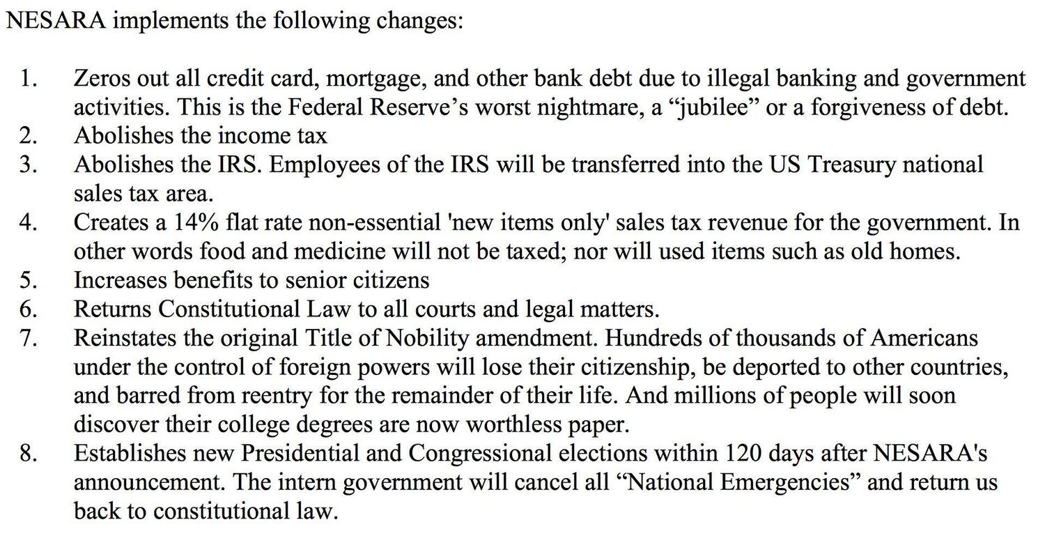 Nesara does away with the Federal Reserve Bank, the IRS, the shadow government, and much more;