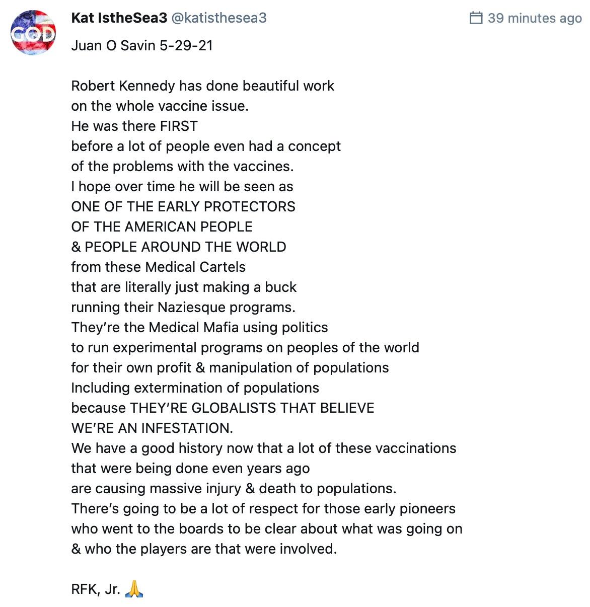 If you wish to find valid, supportive, factual, well documented and recorded facts about vaccinations, environmental/health hazards, historic events and the trails that lead back to the perpetrators, you will find them on his blogs, books, videos, podcasts and the website: CHILDREN’S HEALTH DEFENSE. The information he shares is always clearly researched to bring you the most up to date and pertinent information on your rights, your health and the well being of your family and the world. Thank you Robert Kennedy!