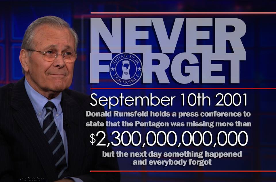 THE DAY BEFORE 9/11 RUMSFELD ANNOUNCED PENTAGON WAS MISSING 2,300,000,000,000. The next day everyone forgot. What impeccable timing?