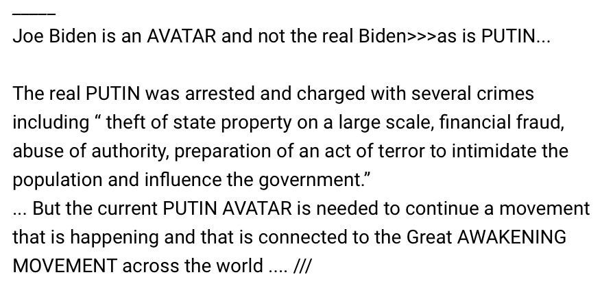 For all the Putin haters, the White Hat in place playing Putin is a body double, switched into his role quite a while ago. Forget his past and notice his actions for the past ten years or so. He is working for the people.
