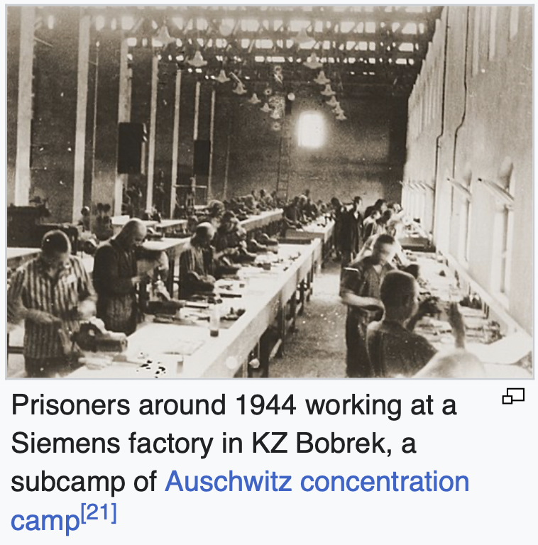 SIEMENS used forced labour during the course of the war, exploiting large numbers of foreign workers and concentration camp slaves, building their own barracks in the vicinity of the Ravensbrück women’s concentration camp for armaments production. They also used labor from Auschwitz and Lublin renting KZ prisoners from the SS.