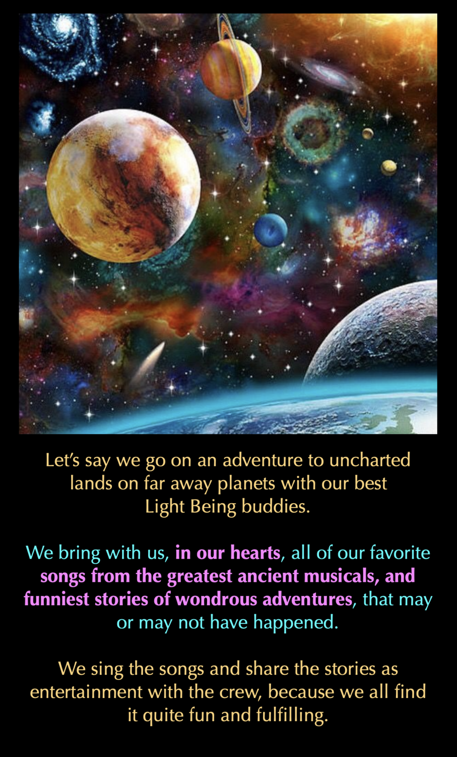 Eventually, someone decides to write it down because they’ve been told, and they wholeheartedly believe, it’s a holy scripture given to them by the Gods, when in fact, it was just a bunch of fun songs and adventure stories shared by a few very playful Light Beings who wanted to laugh together with new friends...all the while knowing it was not something meant to be shared with newer races…for this very reason.
