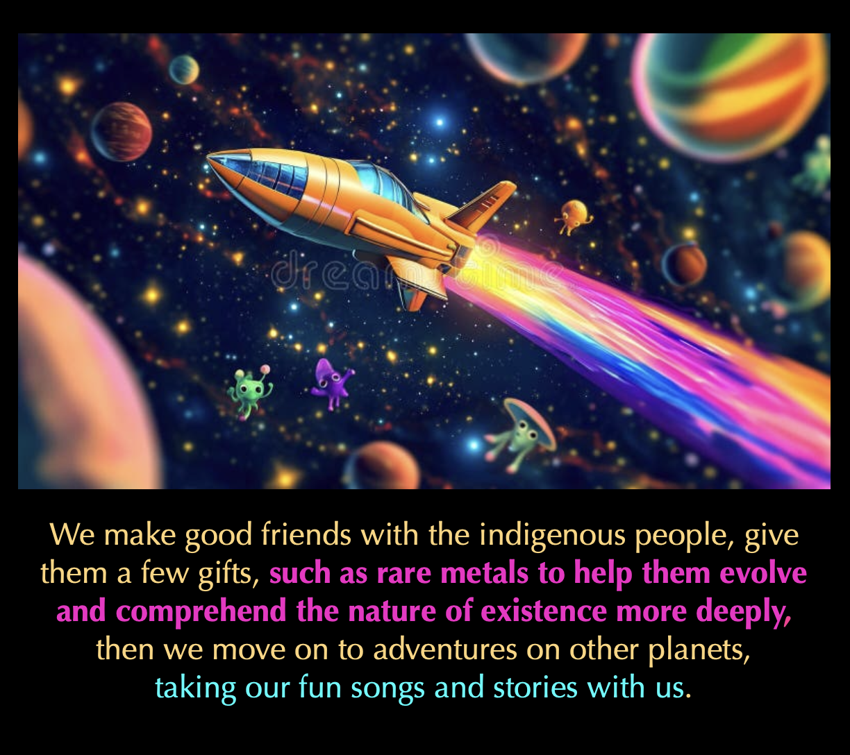 The lovely Indigenous beings perceive the stories and songs as some sort of divine scripture, because it’s coming from Light Beings that arrived from an unknown frequency. The native people have never heard songs so beautiful before…or seen Beings quite as happy and playful.