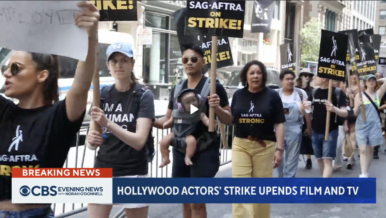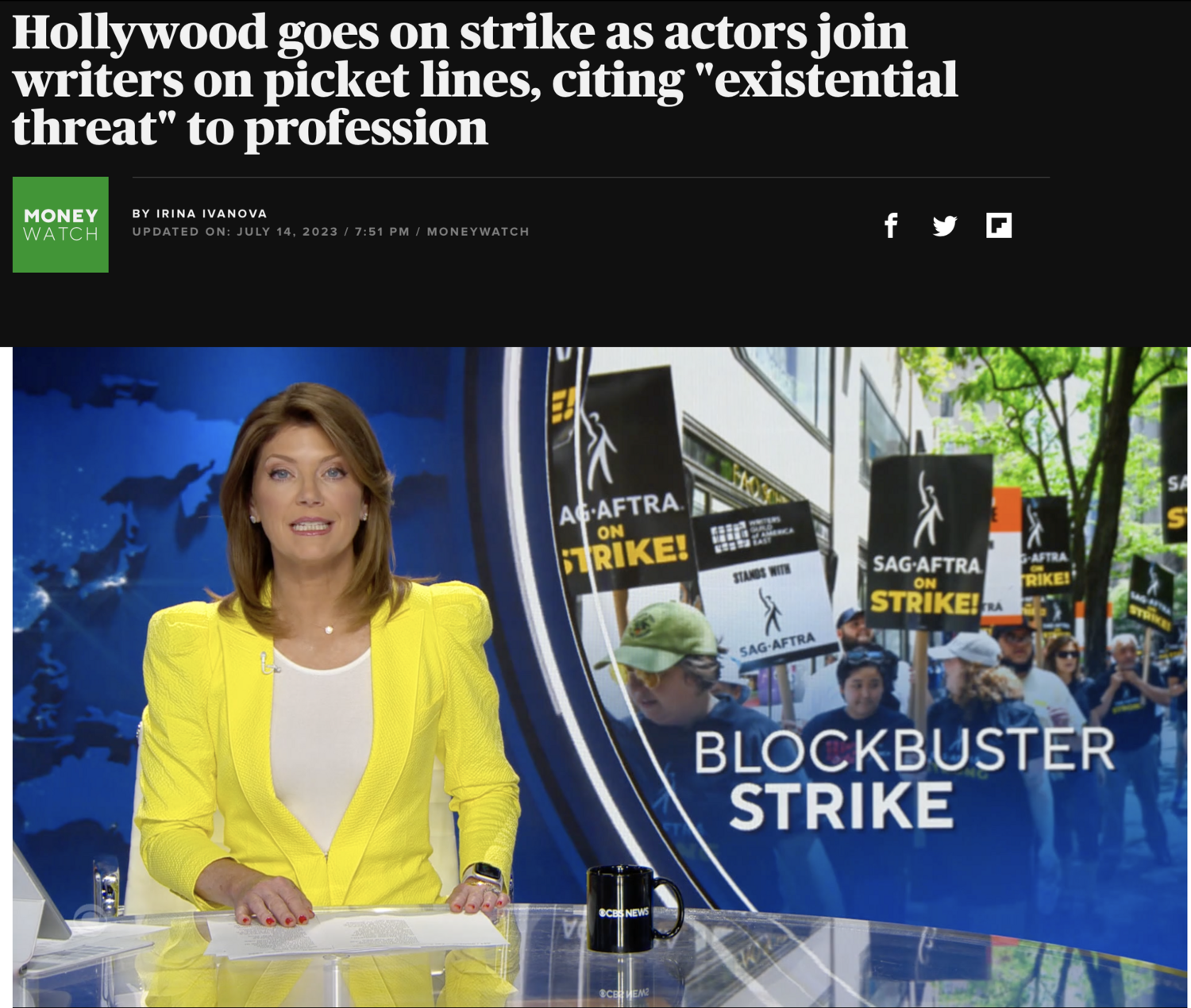 > the FAKE CIA MSM news is saying actors actresses, writers are striking against HOLLYWOOD productions and corporations and ELITES because they are using A.I. to do Hollywood celebrity actors parts in movies and commercial without the actors permission and they are losing money to A.
